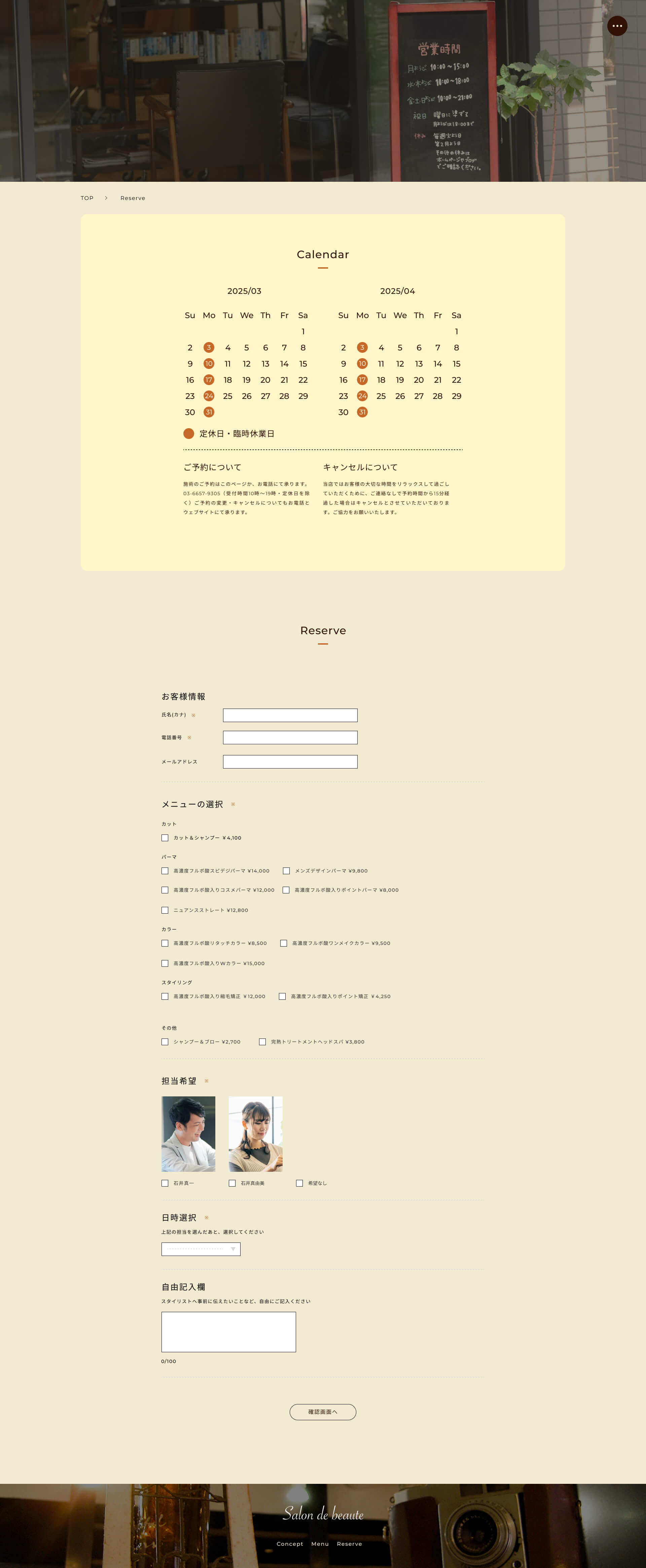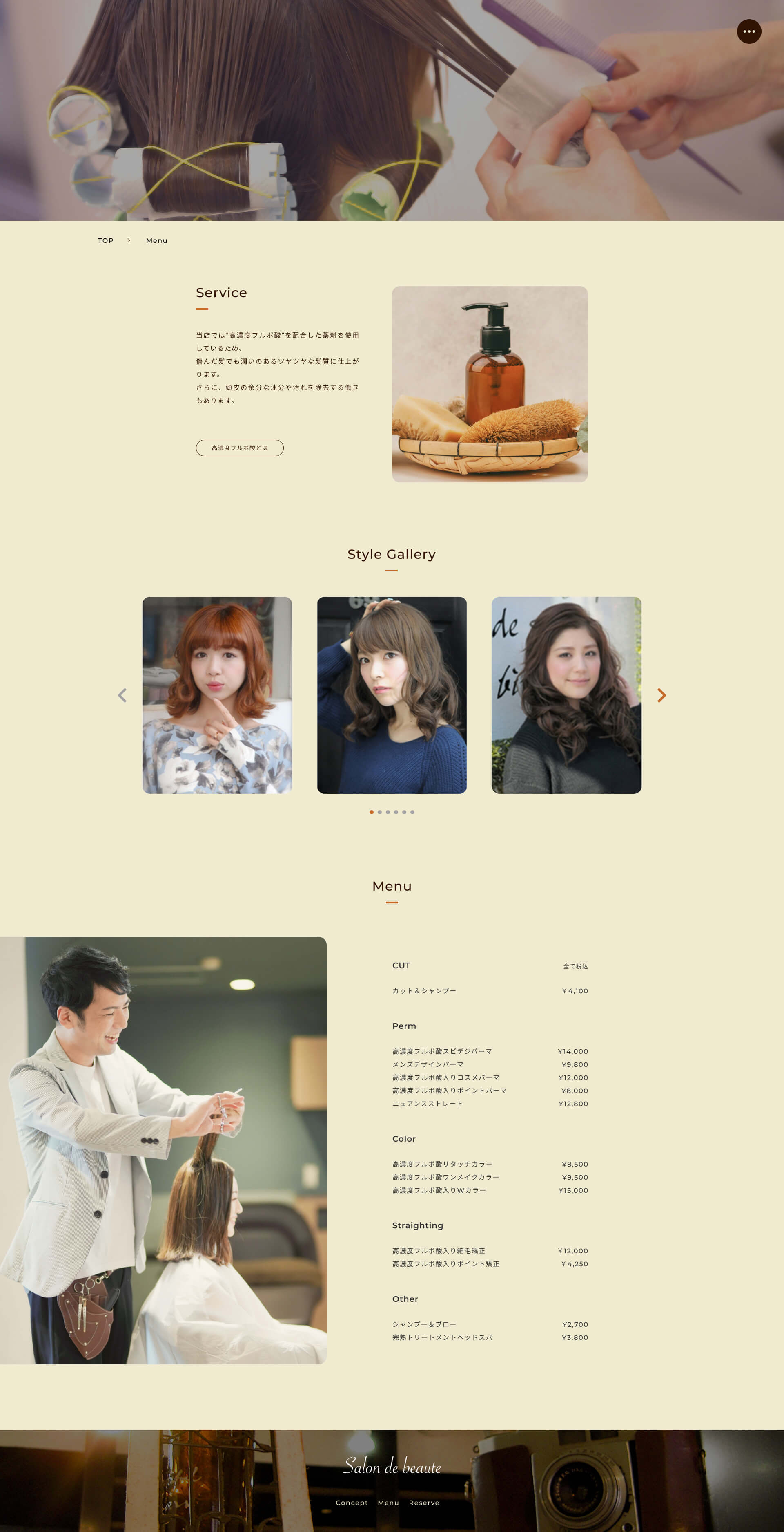 美容室のコンセプトやサービス内容をしっかりと伝えるため、下層ページを作成して情報をまとめました。